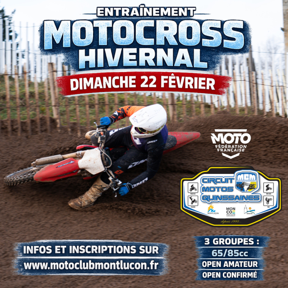 Le Moto Club de Montluçon organise un entraînement Motocross hivernal sur son circuit de Quinssaines, le Dimanche 22 Février 2026 :